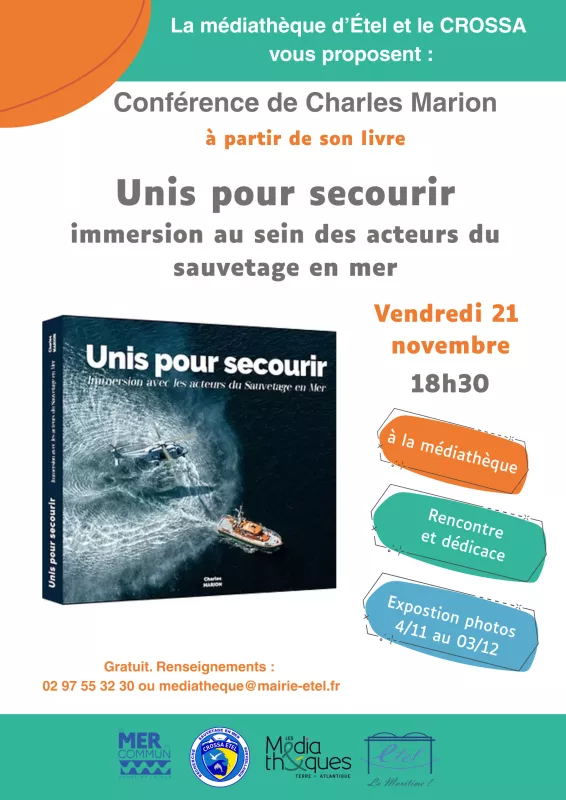 La médiathèque municipale d'Étel accueille du 4 novembre au 3 décembre l'exposition des photographies issues du livre de Charles Marion : Unis pour secourir. Cette exposition, mise en œuvre par le CROSS d'Étel à l'occasion de l'année de la mer, vous présente le quotidien des acteurs du sauvetage en mer grâce aux magnifiques photos de Charles Marion.
