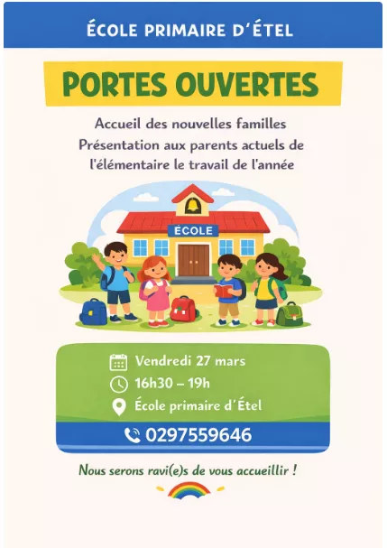 27 03 📣 Portes ouvertes École de la Barre Accueil Culture, sport, vie associative Agenda des événements 📣 Portes ouvertes École de la Barre 📆 Vendredi 27 mars 2026⏲ de 16h30 à 19h📍 Ecole primaire de la Barre - 15 rue de la Barre, Étel Partager cette page Retour aux événements