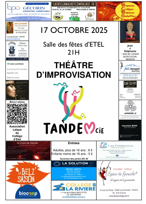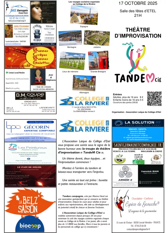 17 10 🎠THÉÂTRE D'IMPROVISATION ORGANISÉ PAR L'ALCE COLLEGE ETEL Accueil Culture, sport, vie associative Agenda des événements 🎠THÉÂTRE D'IMPROVISATION ORGANISÉ PAR L'ALCE COLLEGE ETEL L'ALCE propose une soirée sous le signe de la bonne humeur avec la troupe de théâtre d'improvisation "TandeM Cie", l'occasion d'aider le collège dans ses projets pédagogiques. Partager cette page Retour aux événements